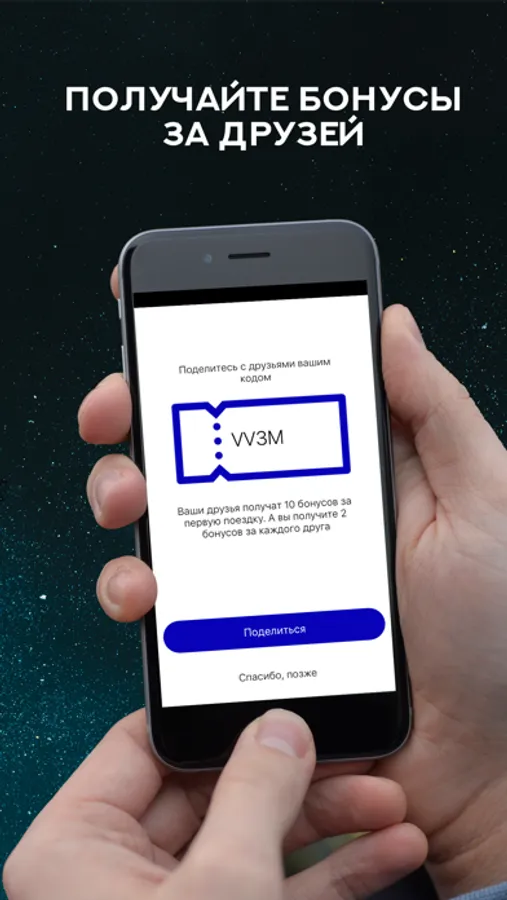Делитесь вашим личным реферальным кодом с друзьями в социальных сетях и в магазинах приложений, получайте бонусы и используйте их для оплаты поездок.