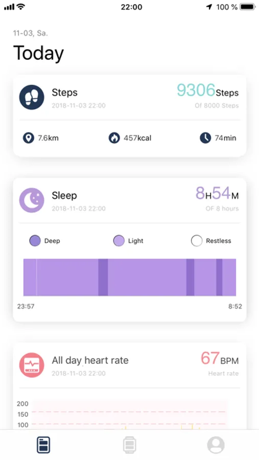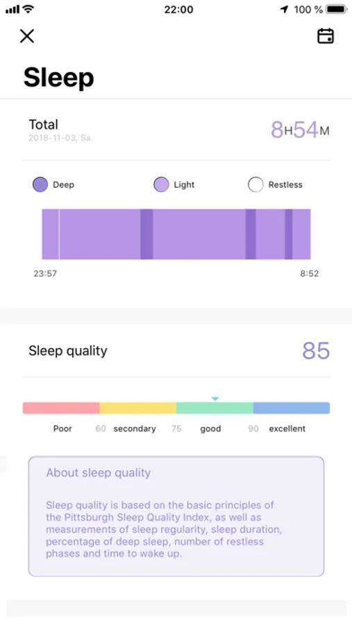 - Sleep: Learn more about your sleep with the integrated sleep analysis. The app shows you the duration of light sleep, deep sleep and restless phases.¹