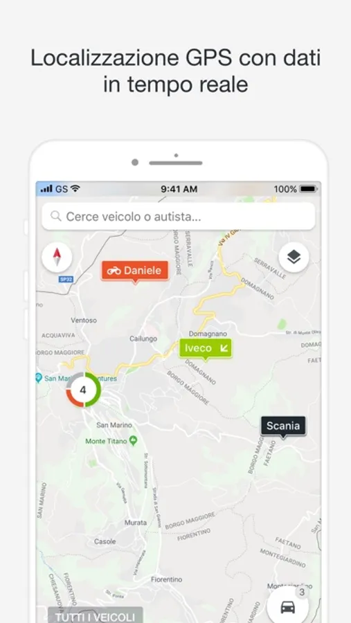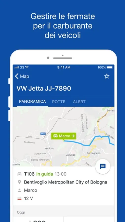 Localizzazione in tempo reale e storico dei percorsi: controlla i percorsi effettuati dai tuoi mezzi, monitora la loro velocità e verifica lo stile di guida dei conducenti oltre a ricevere promemoria per servizi di manutenzione in scadenza.