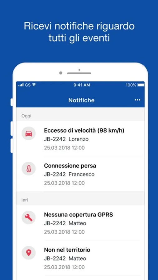 Avvisi e notifiche - imposta alert automatici e ricevi notifiche sul tuo telefono quando i conducenti superano il limite di velocità, guidano all'interno o all'esterno di un area predefinita, perdono il segnale GPS o GPRS, quando il veicolo inizia a muoversi, ecc.