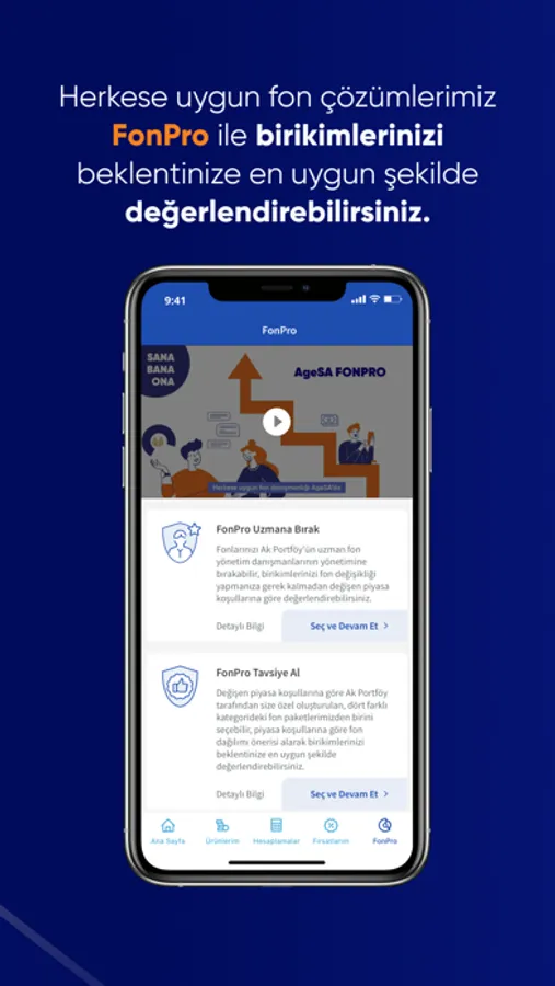 Gelişmiş fon danışmanlığı fonksiyonu ile BES birikimlerinize kolayca yön verebilirsiniz. “Fon Dağılımı” ekranındaki Risk Profil Testi’ni çözerek size en uygun fonları belirleyip fon dağılımınızı AgeSA Mobil’den hemen değiştirebilirsiniz.