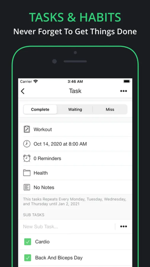 Elegant and custom tasks that provide you with the opportunity to create one time tasks with the following: Reminders, Sub Tasks, Categories, and Notes.