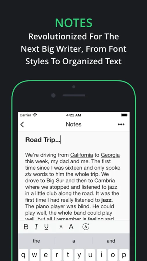 Group notes into various folders where folders can be passcode protected as well. Write short stories or jot down ideas with our new stunning views that include all new font styles (bold, italic, underline, decrease/increase font size, and reset font styles).