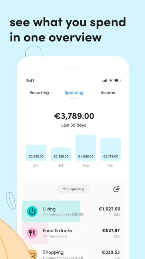 Your subscriptions, expenses (such as groceries) and income are automatically filtered from your bank statements and placed in one clear overview. Giving you more control over your money.
