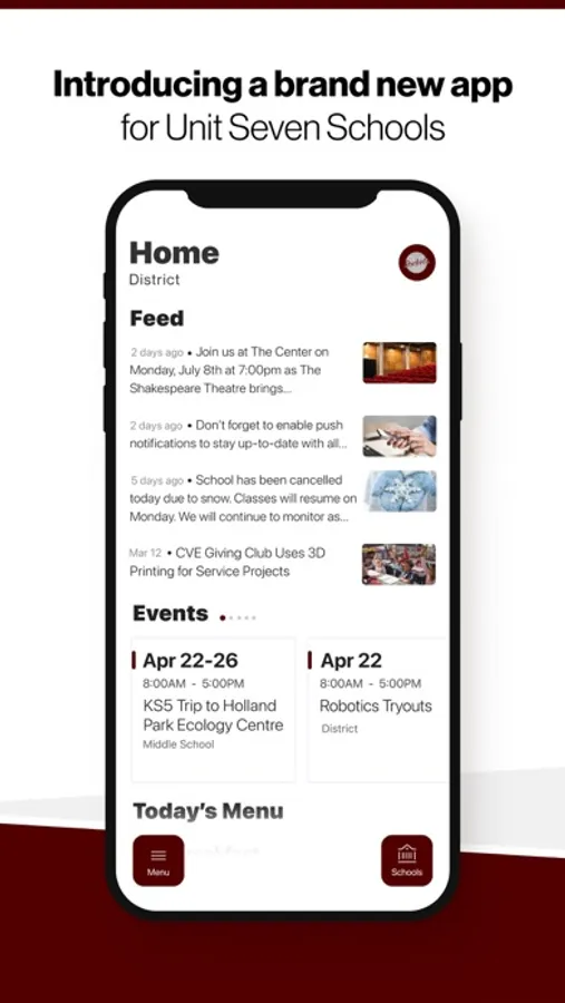 The official app for Unit Seven Schools allows users direct access to the most recent news, announcements and event calendars. Customize the app to display information relevant to a specific campus and to receive important notifications from the district. Users may also access the directory of district faculty and staff, view dining menus, find the location of district events, contact campuses and departments, follow athletic scores and updates, and much more.