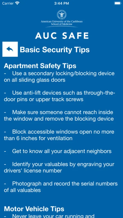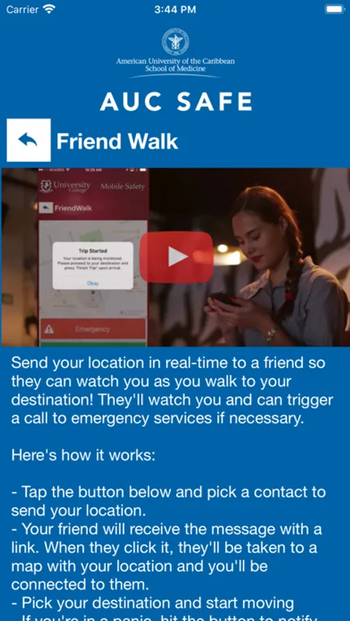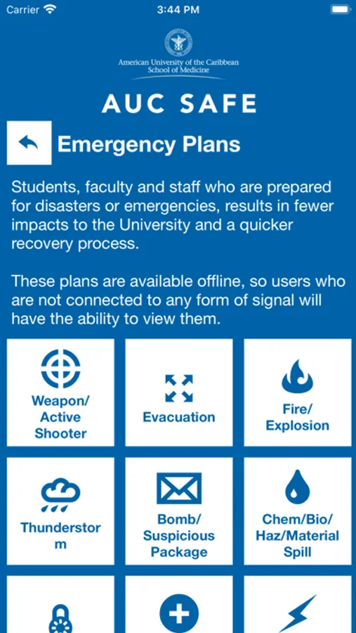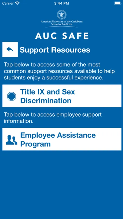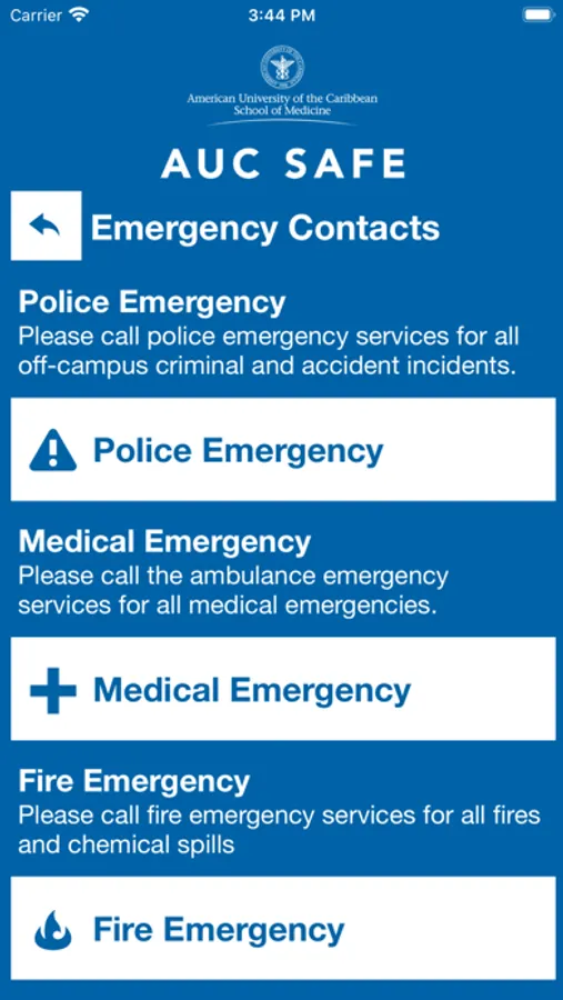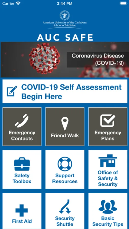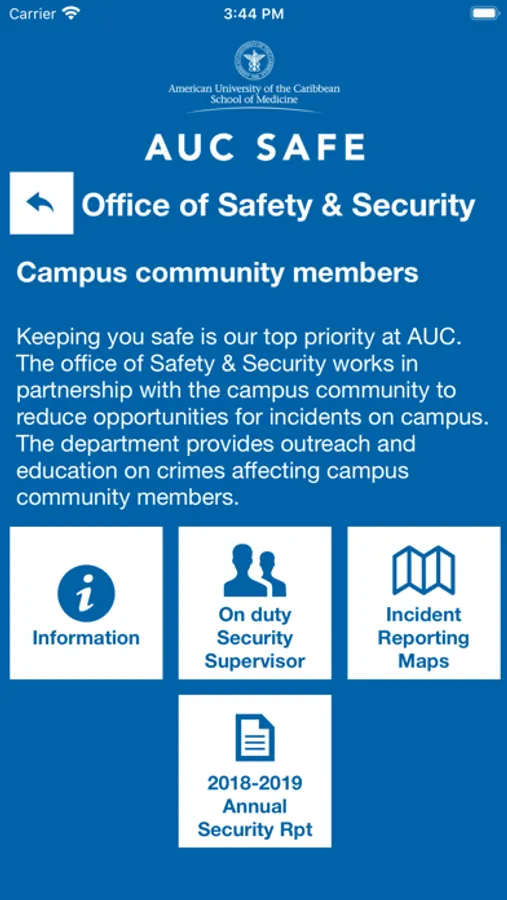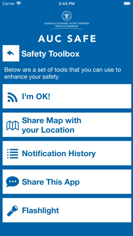 AUC Safe is the official safety app of the American University of the Caribbean School of Medicine. It is the only app that integrates with AUCMED's safety and security systems. Safety and Security has worked to develop a unique app that provides students, faculty and staff with added safety on the AUCMED campus. The app will send you important safety alerts and provide instant access to campus safety resources.