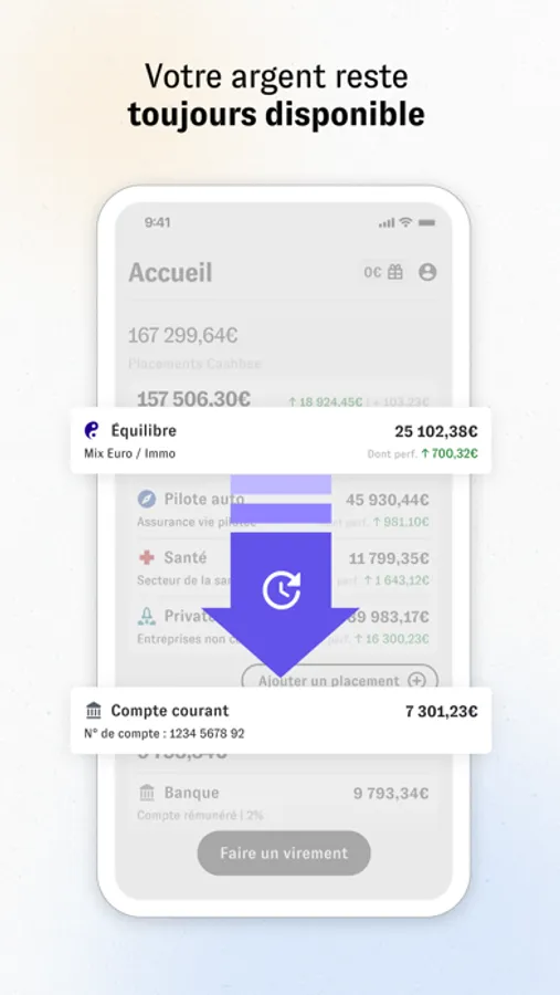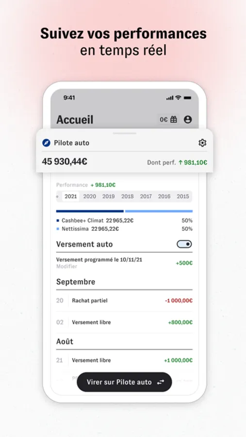 Vous pilotez ensuite votre épargne d’une seule main, tout en surveillant l’état de vos comptes externes, synchronisés à l’app.