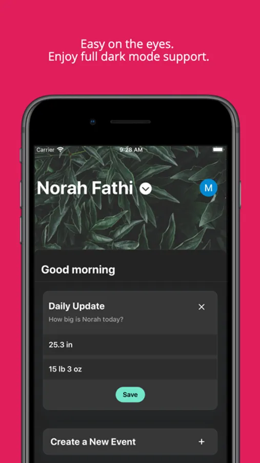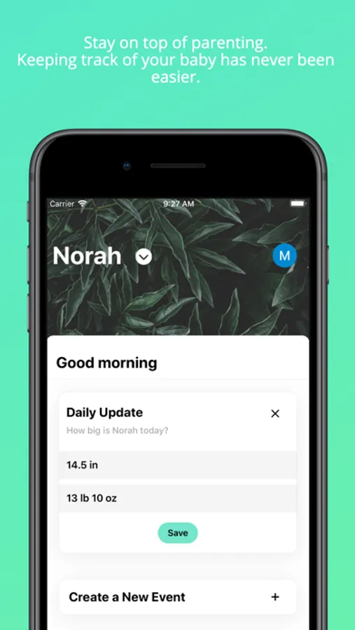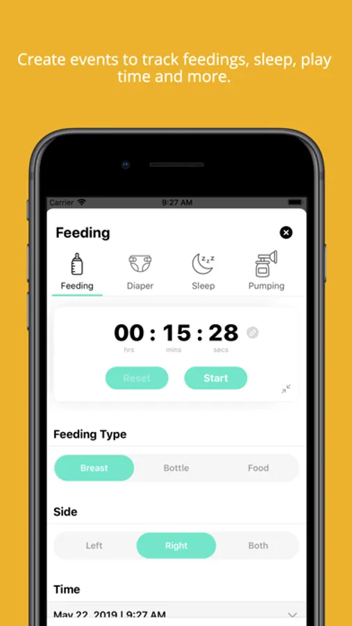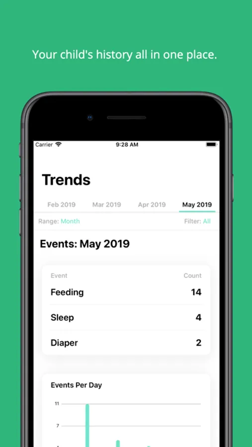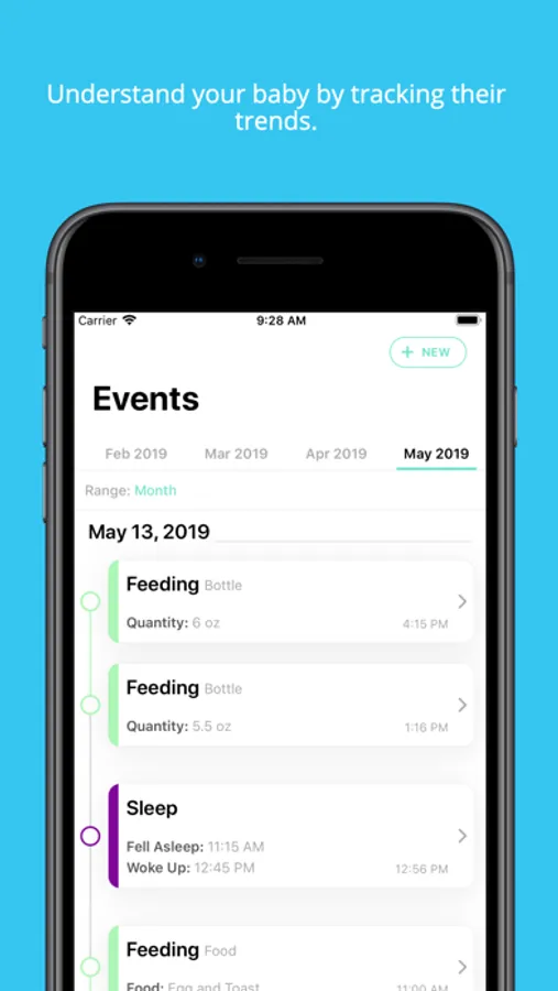 • Track several types of events including: Feedings, diaper changes, sleep and more.