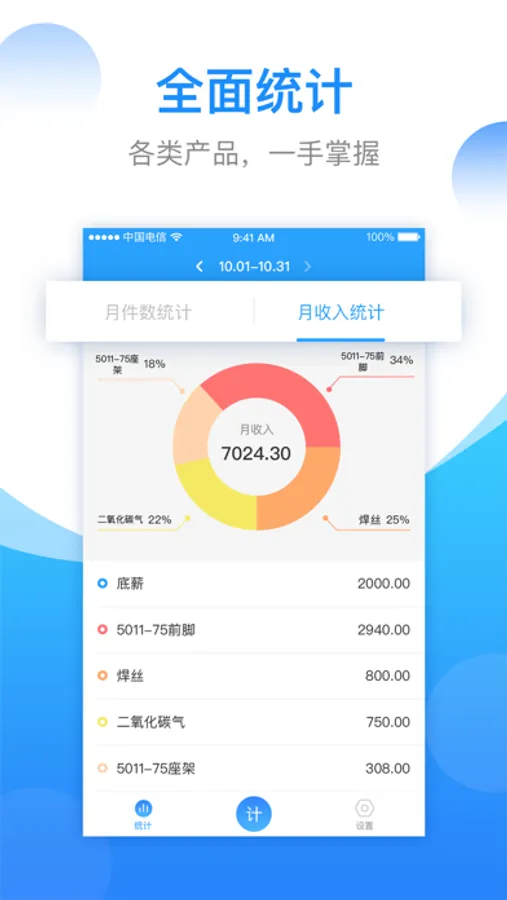 3、统计功能:靓丽的统计页面,用户可以通过饼图了解自己的收入分布。想知道自己每日每月的收入情况,统计功能可以一目了然,对自己的收入了如指掌,也不用担心单位算错记错的情况,让自己的每一分汗水和努力都能得到回报。