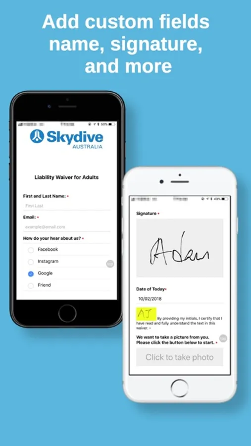 - Collect information from you customers. You can add names, emails, phone numbers, signatures, or initials, etc. on your digital waiver. You can add any fields you need to the digital waiver template. We will store your customer information securely on our cloud based database.