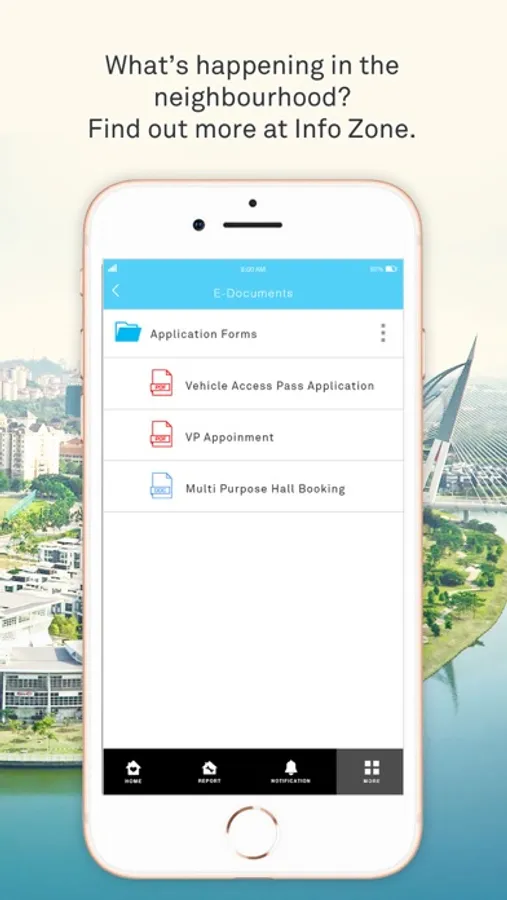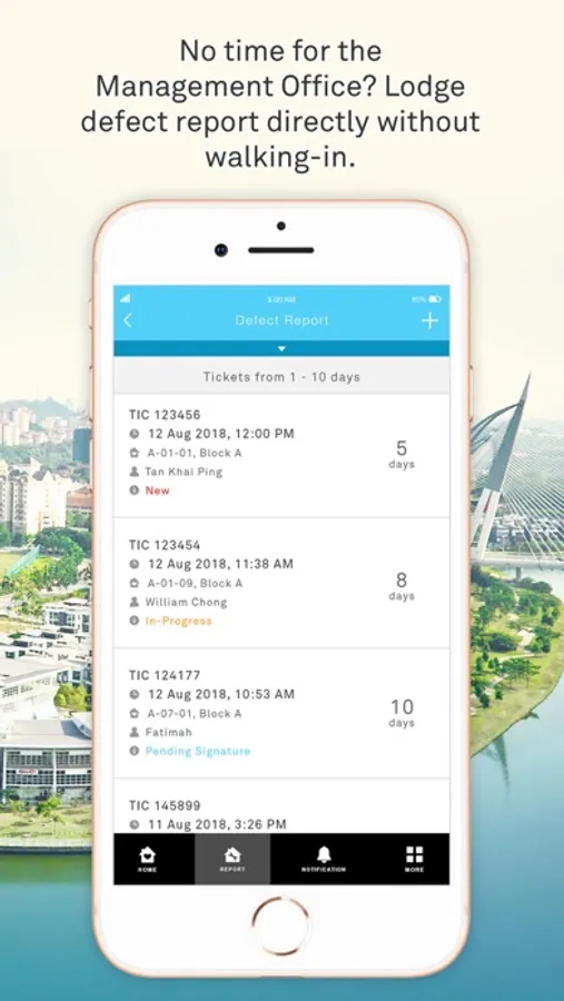 Defect Report - provides a platform for residents to lodge a report regarding an incident or defect occurring within the neighbourhood, without having to go to the Management Office. Residents are likewise always kept updated with the latest status of the report.