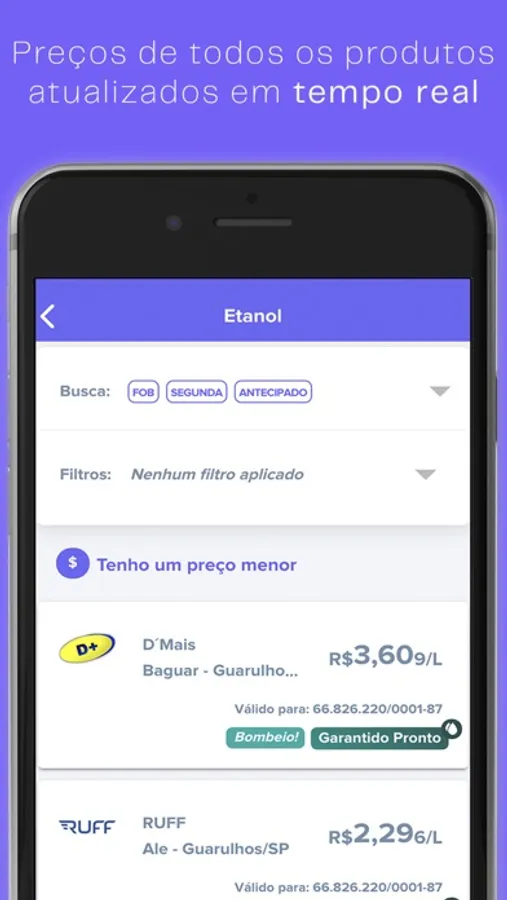 . COTAÇÃO EM TEMPO REAL: acesso aos preços em tempo real das principais distribuidoras.