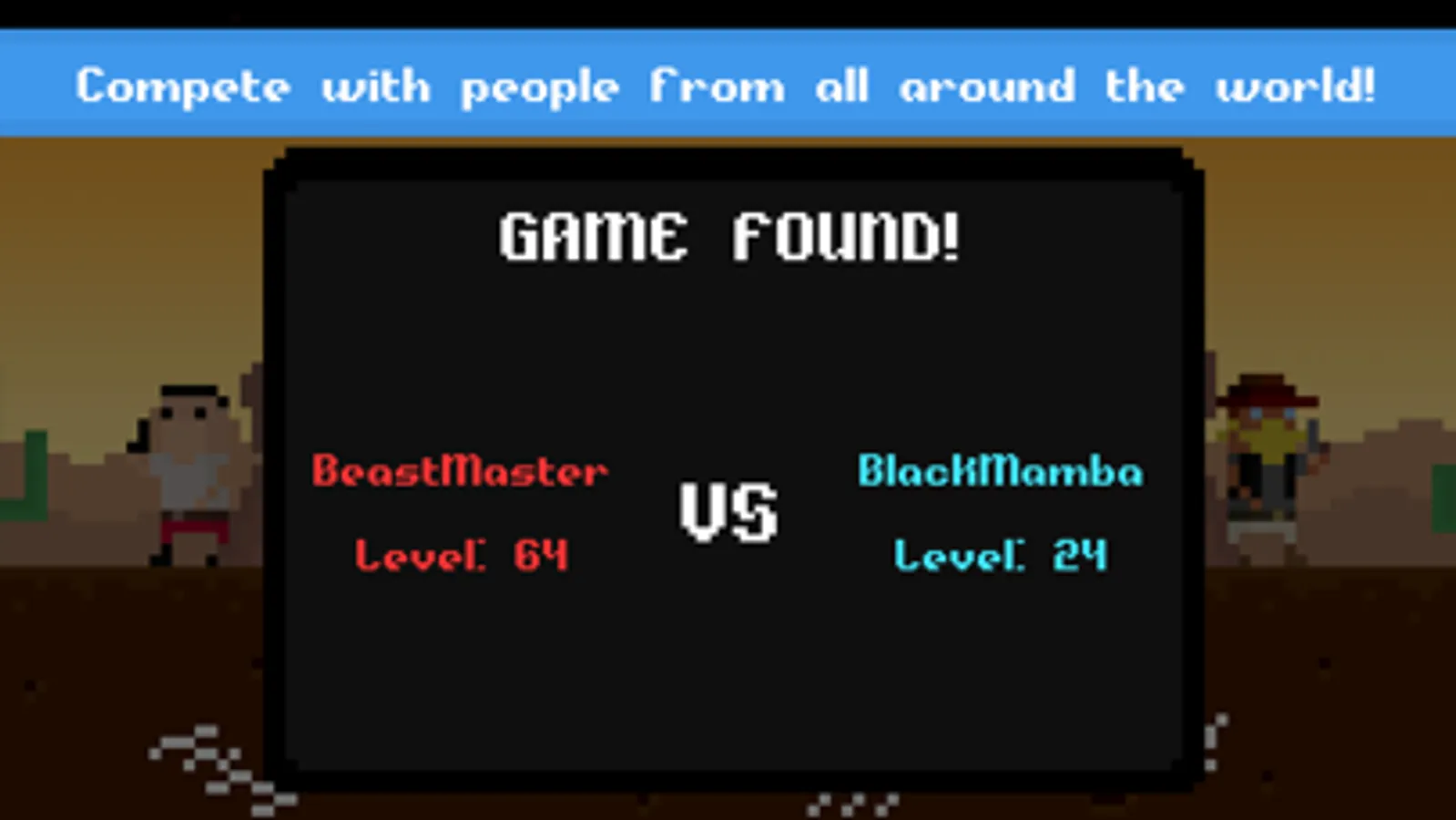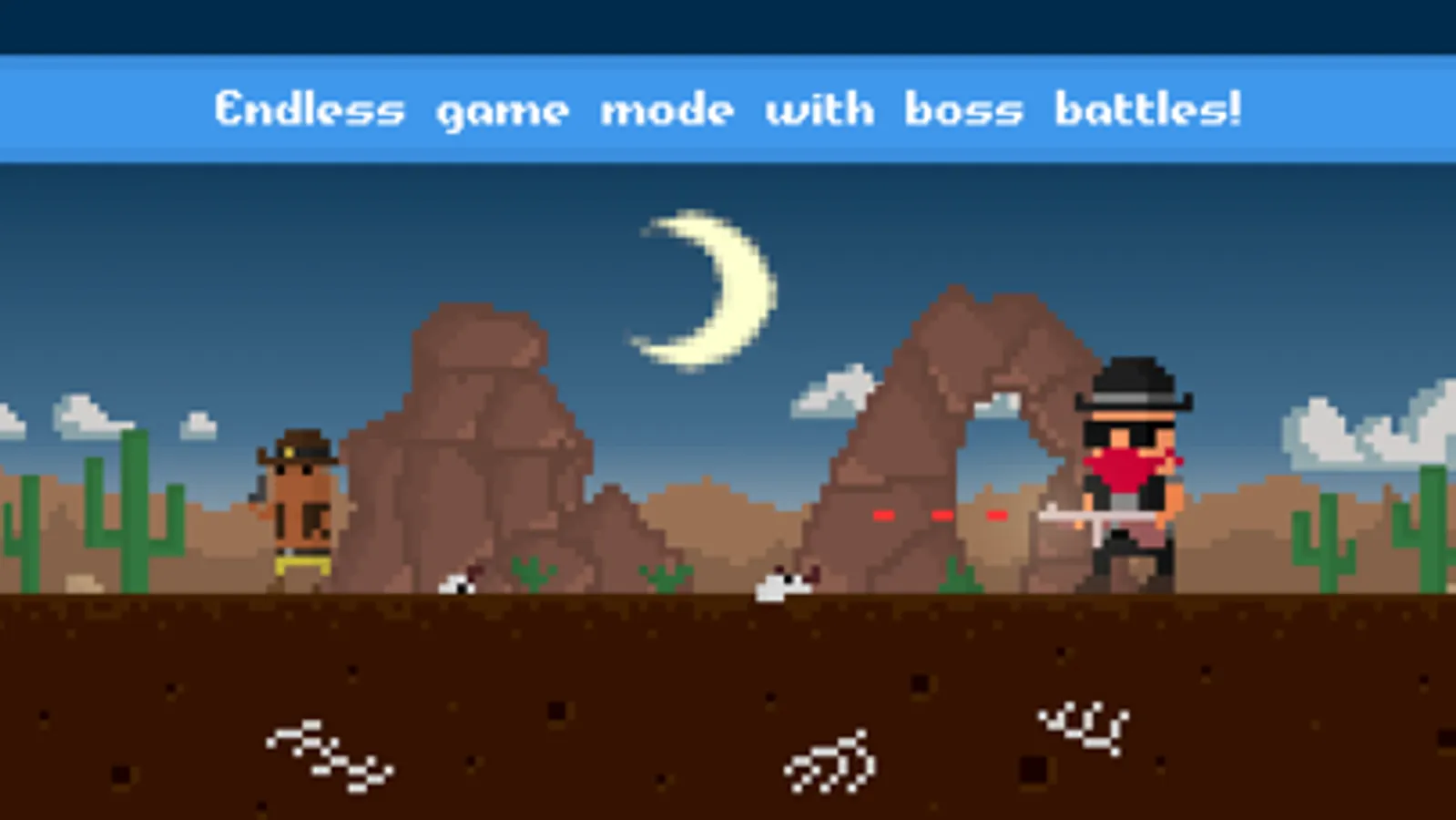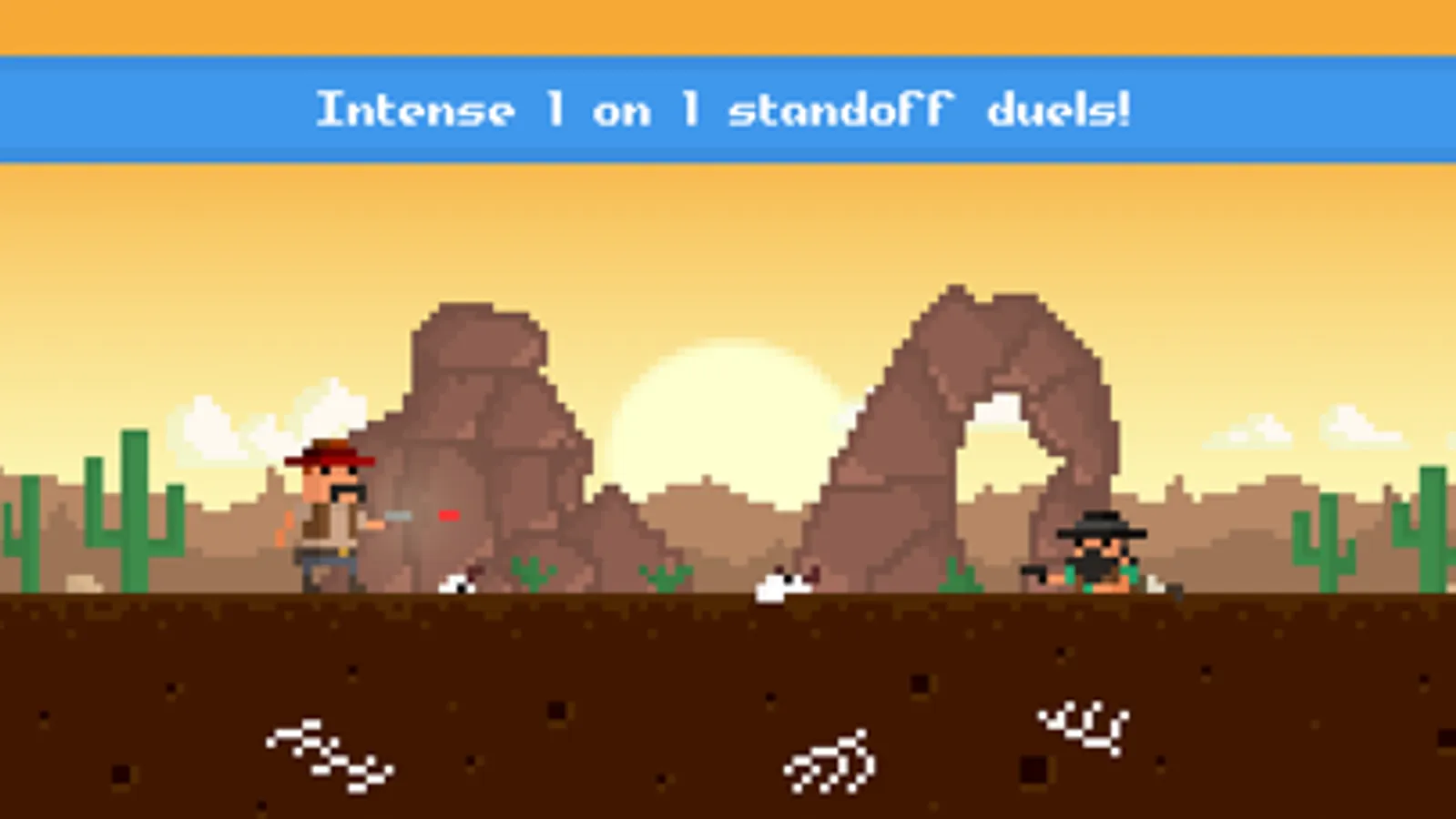 Desert at the sunset. You can feel the tension in the air. Two cowboys, face to face. Only one can survive. Challenge your opponent in an intense standoff duel. Test your skills and reflexes. Dodge the bullets. Outwit your opponent and celebrate the victory!