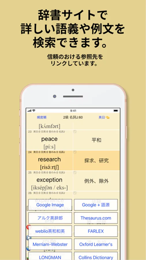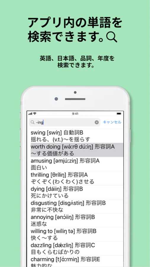 検索ページでは単語や意味、発音記号から検索することができます。検索した単語から品詞別リストへ移動できます。