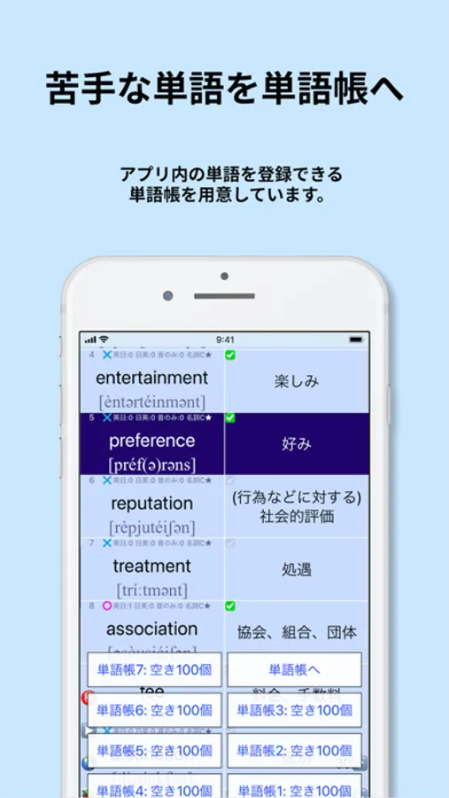 「日本語訳」のセル右上をタップするとチェックされ、チェックした単語を「単語帳」に登録できます。