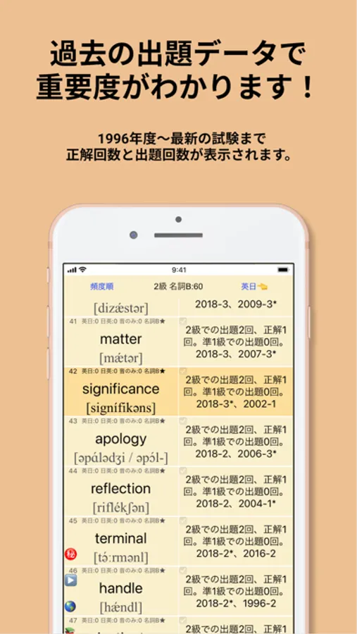 英検の語彙問題は過去問から多く出題され、頻出の単語は繰り返し出題されています。アプリ内の各品詞のステージ1範囲には正解として出題された単語と選択肢としての出題回数が多い単語をまとめています。優先的にステージ1範囲を学習することで効率よく合格点へ近づくことができます。