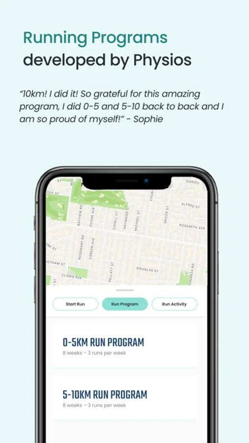 • 0-5km, 5-10km, 10-21km Physio approved running programs with audio cues