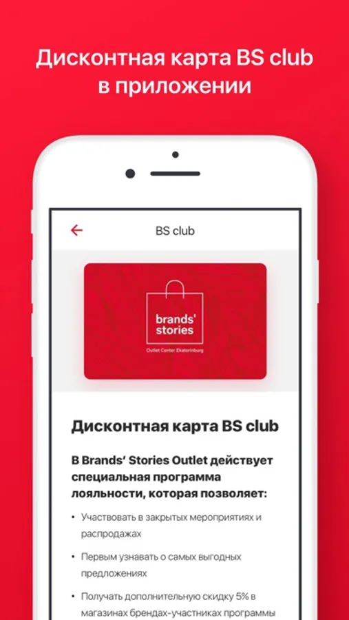 Brands' Stories Outlet в Екатеринбурге предлагает стать частью привилегированного клуба покупателей! Зарегистрированные пользователи мобильного приложения первыми получают сообщения об акциях, мероприятиях и специальных ценах.