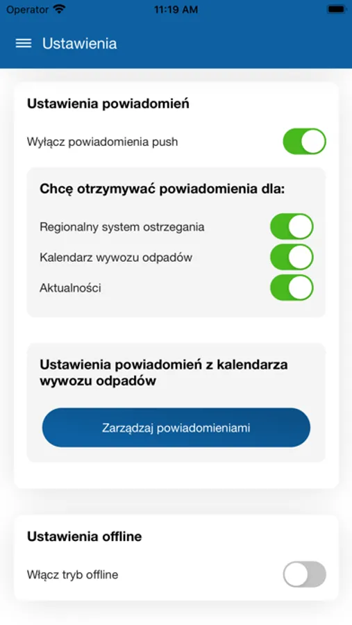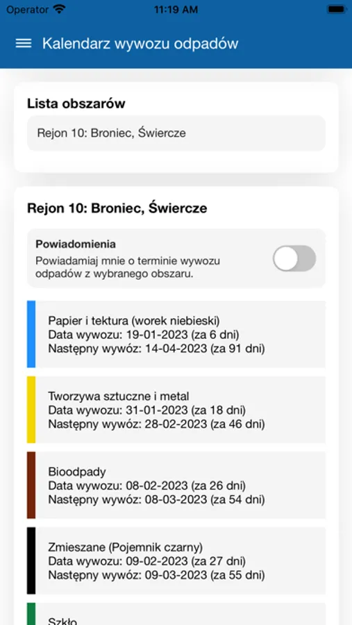 Aplikacja przypomni o terminie odbioru poszczególnych odpadów, poinformuje o zasadach prowadzenia selektywnej zbiórki odpadów, powiadomi o aktualnościach związanych z tą tematyką. Moduł umożliwia dodatkowo wysyłanie reklamacji odnośnie braku odbioru odpadów, uszkodzonego pojemnika lub innych sytuacji.