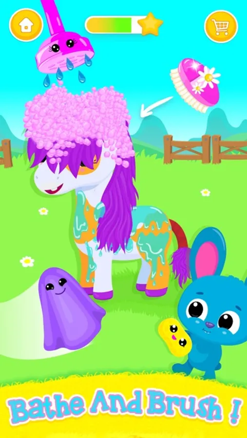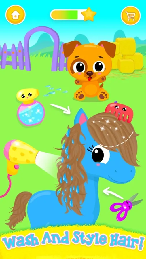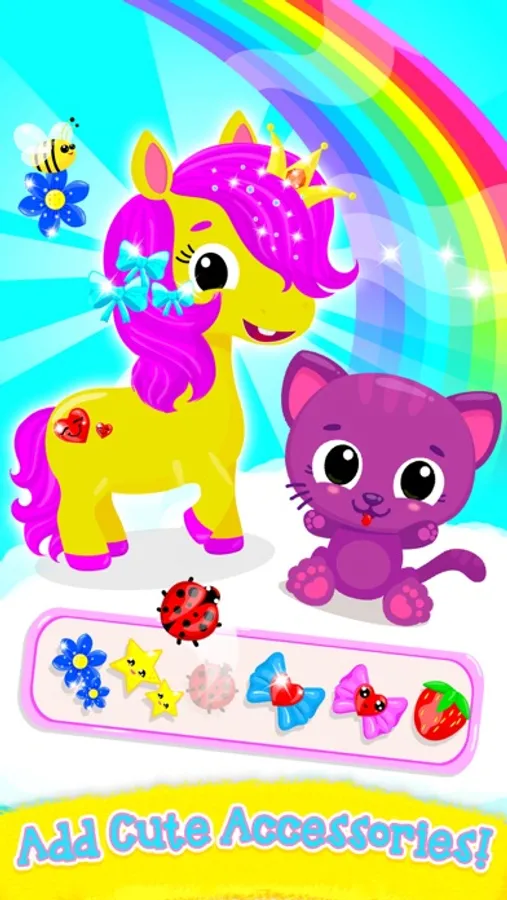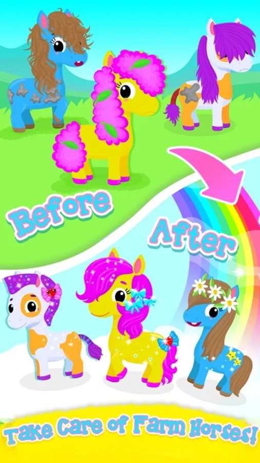 Choose among three super cute and colorful horses and take care of them! Wash and dry the babies’ fur! Pop all the bubbles! Brush the farm horses! Now wash and style their beautiful colorful hair! Add supper cute accessories: flowers, hearts, bees, stars, bows and more! Did you know that a rainbow appears when horses and ponies are happy? Make your colorful horses super happy by taking good care of them! Good job, little helper!