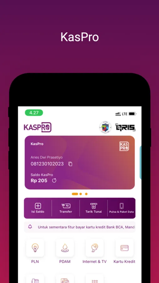 KasPro adalah solusi untuk berbagai kebutuhan pembayaran digital Anda. Dapatkan penawaran terbaik untuk pembelian pulsa, PLN, paket data, internet & tv, tagihan PDAM, pembayaran asuransi, berinvestasi, bayar dengan Barcode di toko favorit Anda. Mudah, praktis, dan aman!