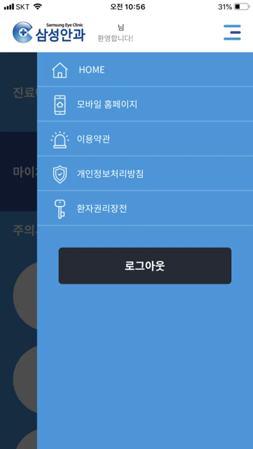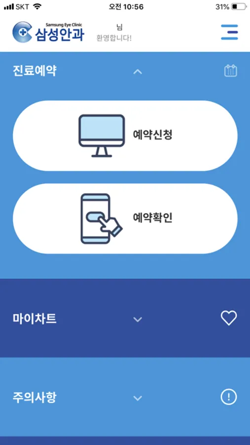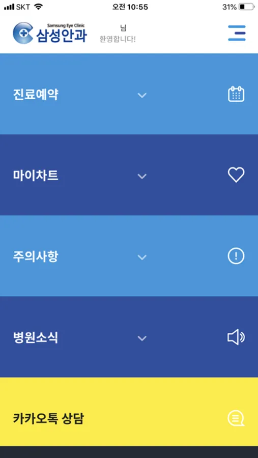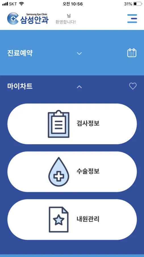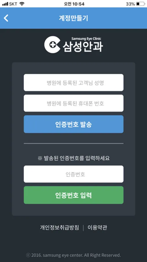삼성안과 병원에 등록된 고객에 한하여 인증을 거친 후 앱을 사용할 수 있으며, 앱 로그인 및 인증 관련된 문의 사항은 병원으로 연락 주시기 바랍니다.