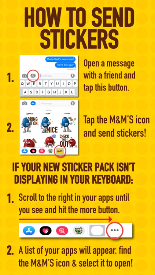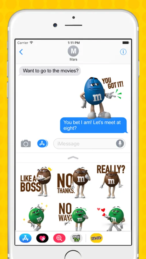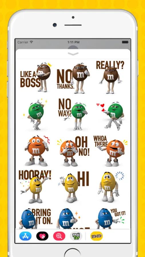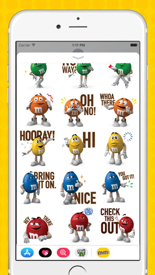 Hungry for some fun stickers? Add some bite-sized personality to your messages with stickers based on your favorite M&M'S character. Each sticker represents sentiments as varied as the M&M'S themselves!