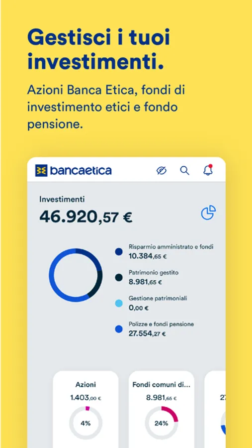 Gestisci i tuoi investimenti: azioni e obbligazioni di Banca Etica, fondi di investimento etici, titoli di stato italiano, fondo pensione.