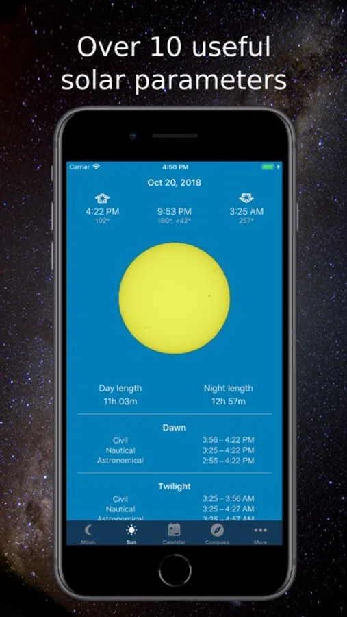 - The Sun view with over 10 useful parameters, including sunrise and sunset, dawn, twilight, length of day and night