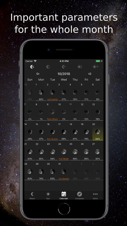 - The Moon view with over 15 useful parameters, including the current phase of the Moon, illumination, rise and set of the Moon, the dates of subsequent phases