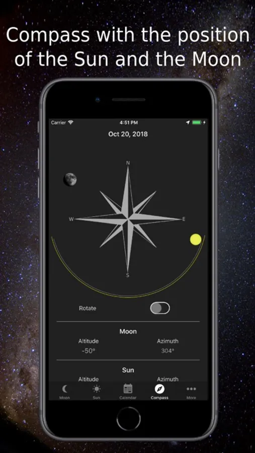 - compass view is the visualization of azimuths of the Sun and the Moon (and elevation angle) for the selected location