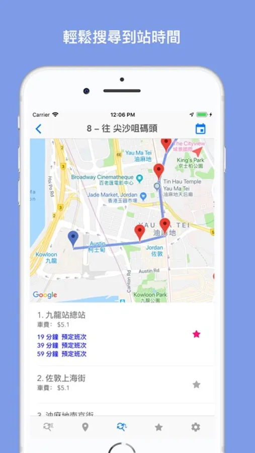 2. 搜尋路線 - 可以搜尋到香港巴士路線,優先顯示最近的車站(需在設定開啟),顯示車站在地圖上