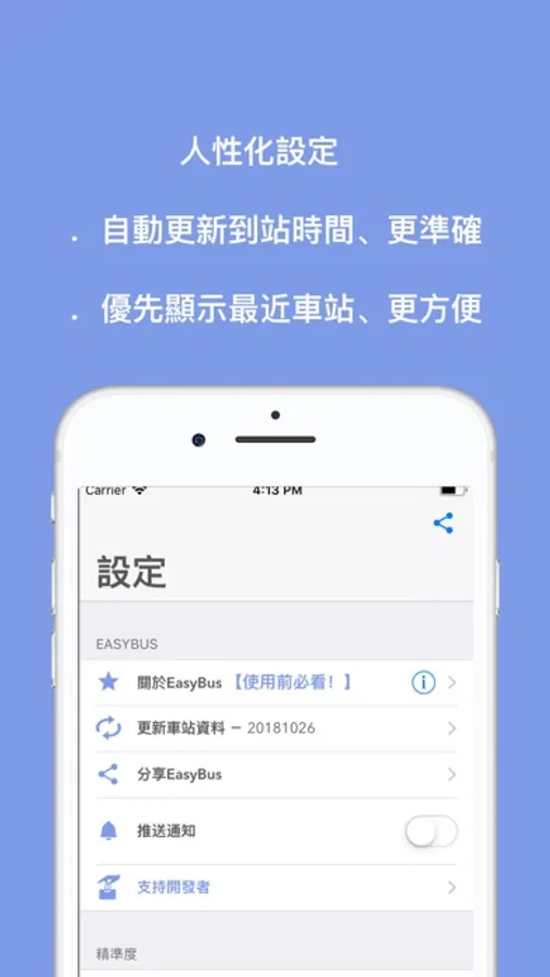 4. 人性化設定 - 提供多種自訂選項,例如: 到站時間自動更新,優先顯示最新的車站等等提高用戶體驗的功能