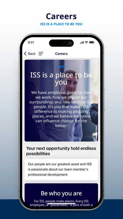 Get all the support you need in our Team ISS app with easy access to career opportunities, insights about our company, detailed investor information, the multitude of services we offer, and more.