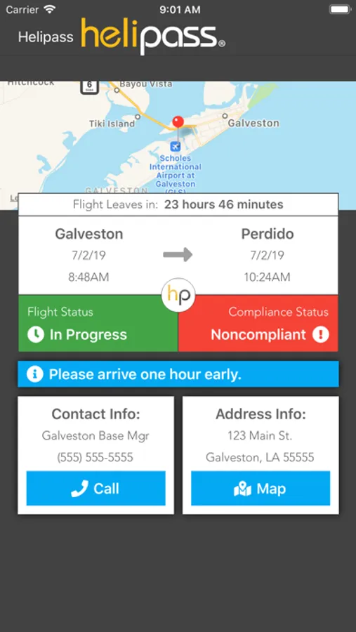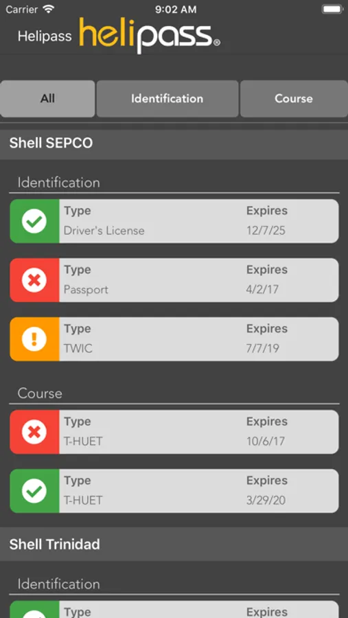 The Helipass Passenger application allows you to view your upcoming trips and trip history. You may also see the current state of your compliance information in the Helipass system without visiting a Helipass kiosk.