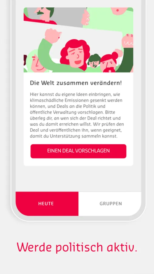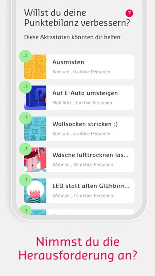 Ein guter Tag hat 100 Punkte hilft dir, deinen Lebensstil klimafreundlicher zu gestalten und politisch aktiv zu werden. Berechne zuerst deinen Fußabdruck: 100 Punkte sind das Ziel. Schaffst du das? Wir zeigen dir, wie du mit unseren Challenges Punkte sparen und klimaverträglich leben kannst. Zusammen mit anderen gelingt dir das leichter: Tausch dich in Gruppen aus, hol dir Tipps und Unterstützung und fordere deine Freunde und Familie heraus. Gleichzeitig könnt ihr politisch aktiv werden und wichtige Forderungen zum Klimaschutz an eure Politikerinnen und Politiker richten. Nur gemeinsam können wir der Klimakrise entgegentreten. Werde Teil unserer Community und verändere die Welt.