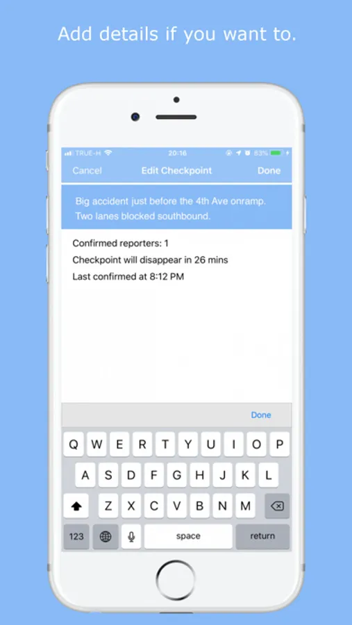 CheckPointz allows you to post the location and description of accidents, roadwork, or other physical barriers on the road that lead to traffic jams and delays.