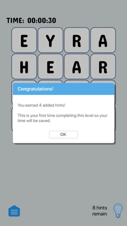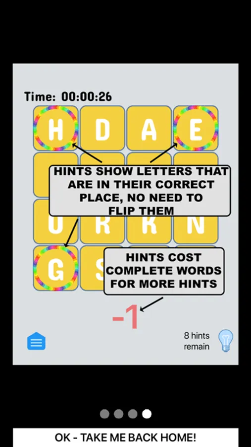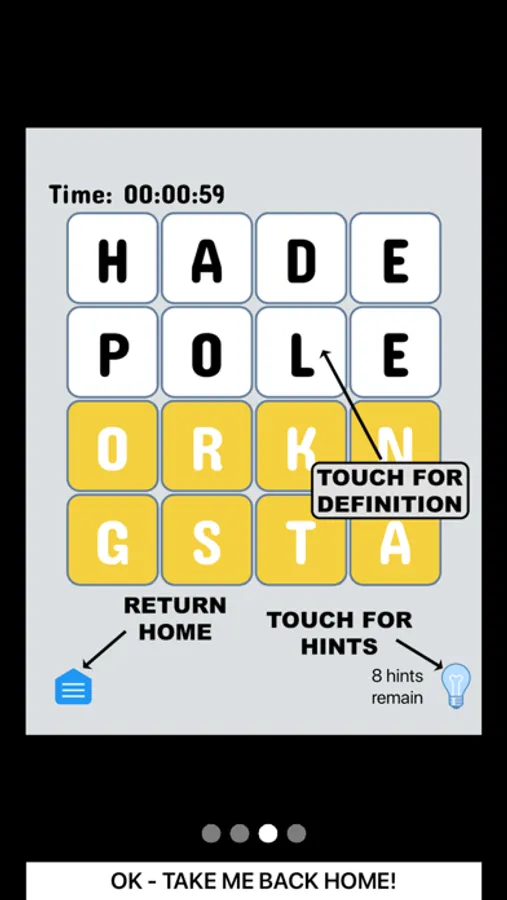 Touch the hint button and all letters that are in their proper place will be briefly highlighted. Using a hint will cost you a hint. You must solve for the word the app has chosen - which will probably help teach you new words! When you find WordWise Min too easy you can always upgrade to WordWise MAX!