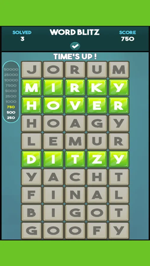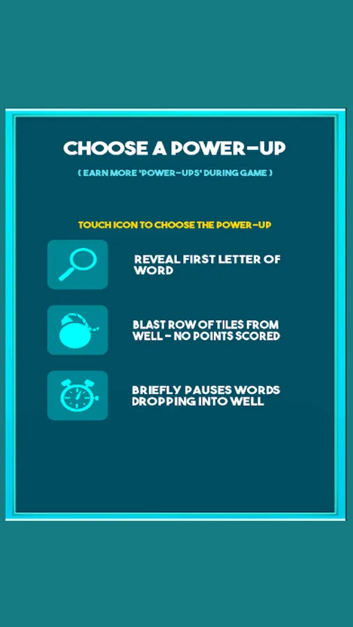 Unscramble the words as they drop into the well. Correct words will clear from the well. Use 3 special boosts to help keep well clear. Once well fills with words the game ends. As game progresses, words spawn quicker; but fear not the three special boosts are helpful to blast words from well, reveal first letter of words, and freeze spawning.
