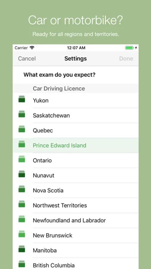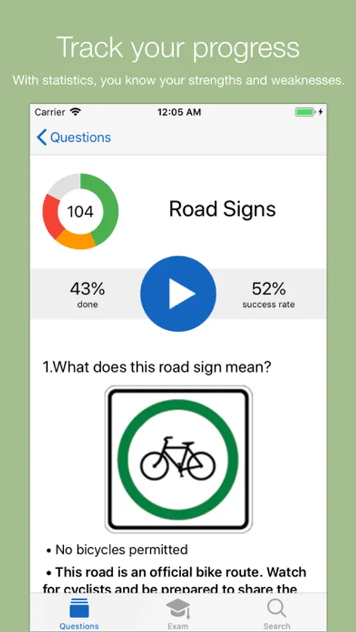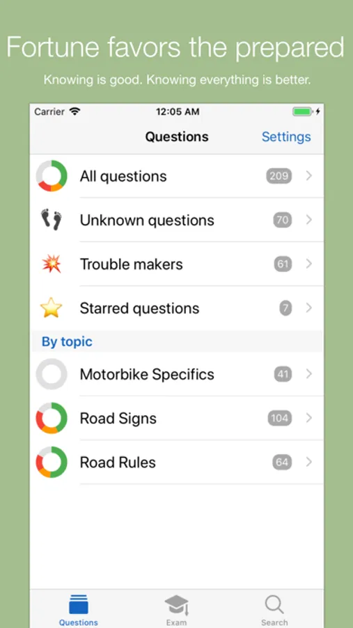 You can practice questions by topic (signs, traffic situations, rules), trouble-making questions or starred (favorite) questions.