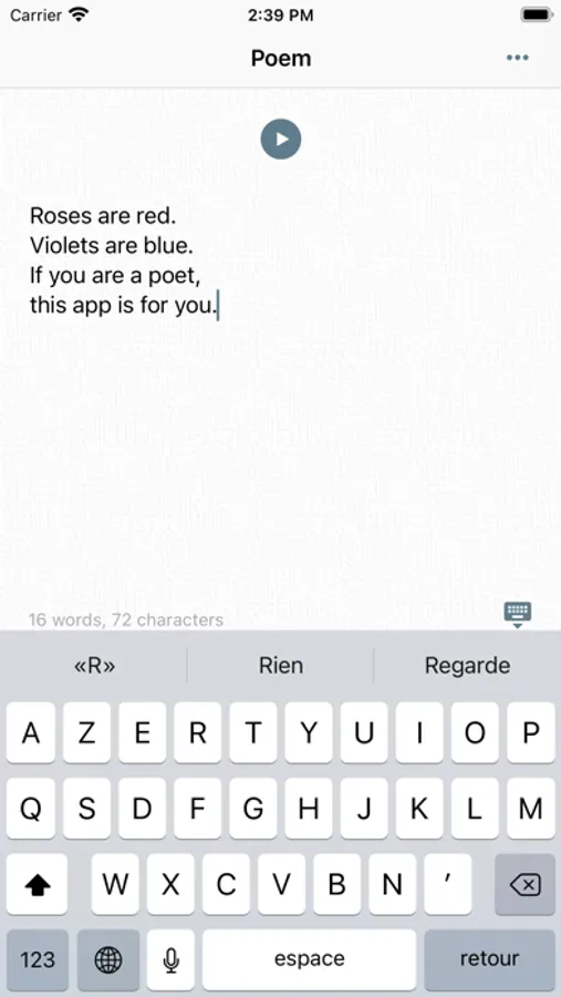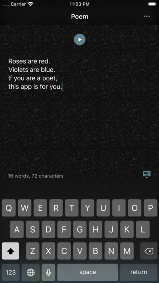* a screen where you can enter your poem text, have it read aloud back to you by the device's text-to-speech engine, and see the word/character count.