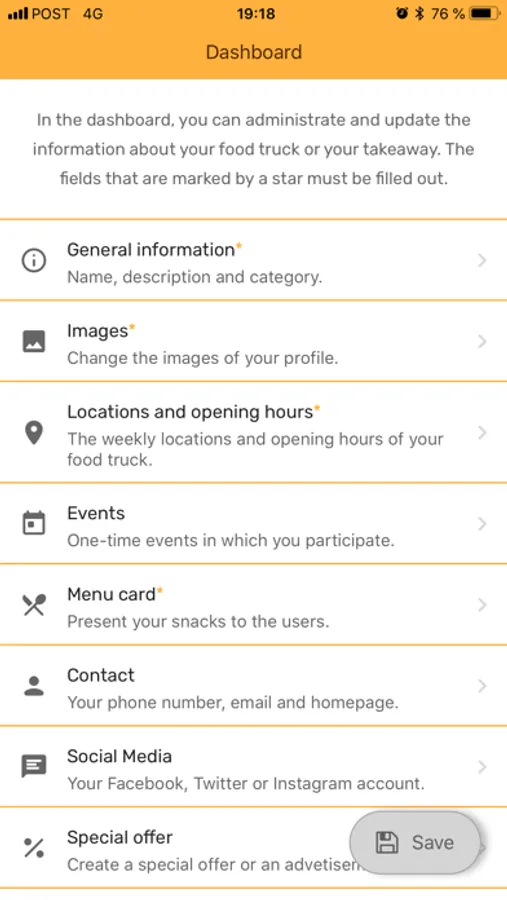 After a short verification of your data, you’re a permanent member of the Snack Track community in next to no time and you can always keep your customers up-to-date thanks to our useful app. Of course, you can edit and change the data shown on the main app at any time by updating your data in the manager app.