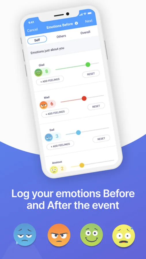 Emotion Log is the app’s main instrument Here you may select the emotions and feelings about Self, Others, and Overall before rating how strong they are. Glad, Mad, Sad, Anxious - how would you describe your emotions at the moment?