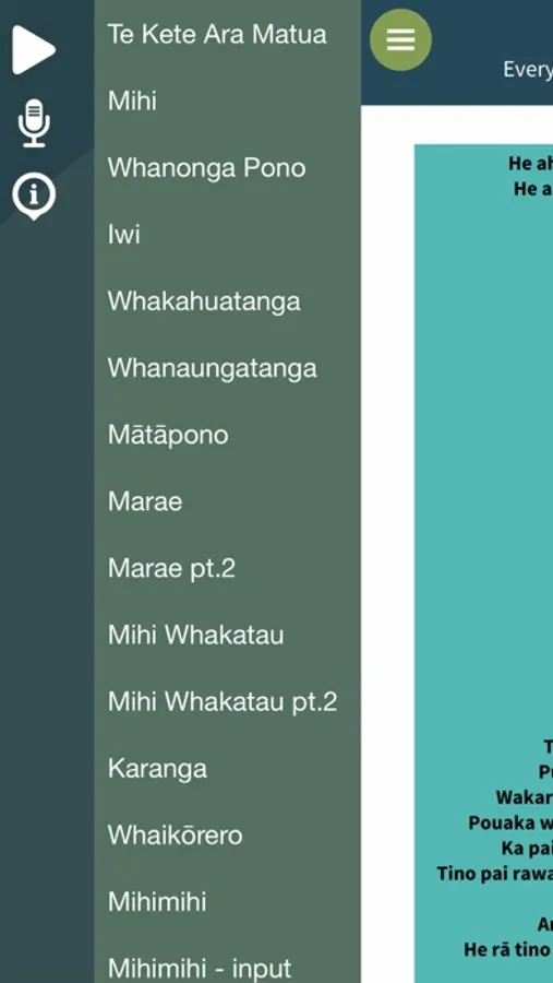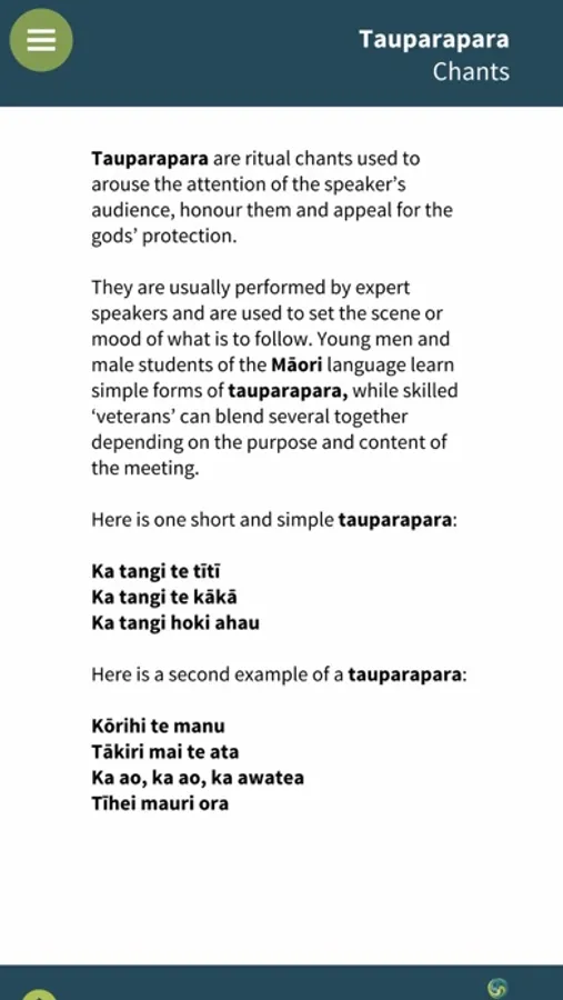 Interactive features within the app include pronunciation of Māori words, maps with Māori names and iwi groups, values (Ngā Mātāpono), and principles, mihimihi/pepeha (introductions), ngā mihi (greetings), poroporoaki (farewells), whakataukī (proverbs), and waiata (songs).