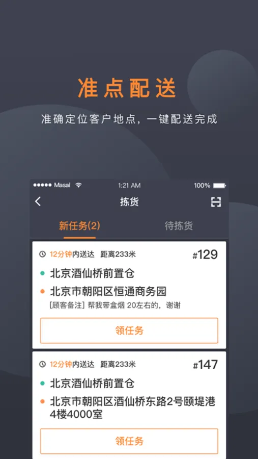 蜂骑士是一款为新零售行业定制打造的配送员配送管理工具,提供快速调度下单,配送员自动接单,指导配送员按时到达取货点,提前预知货物信息,精准定位目的地,最优路线及时送达,随时随地查看历史任务等服务。