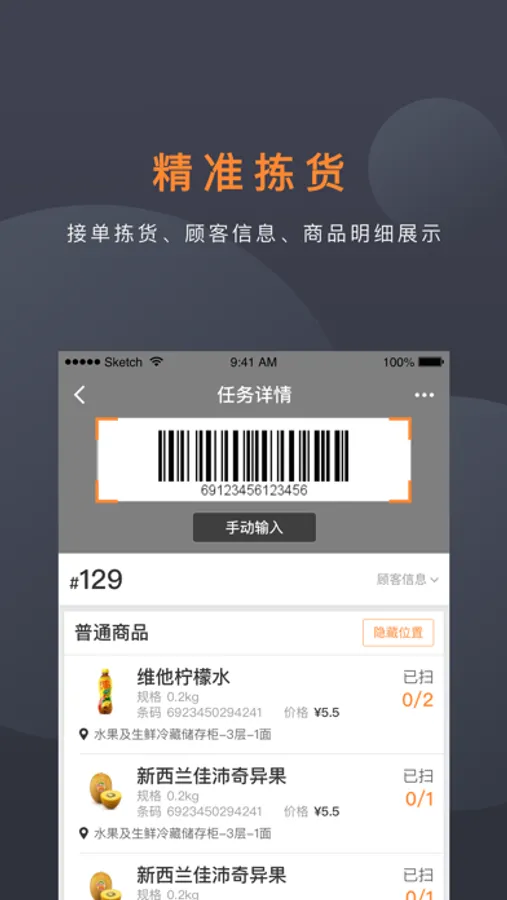 接单拣货,顾客信息、商品明细、订单信息展示。