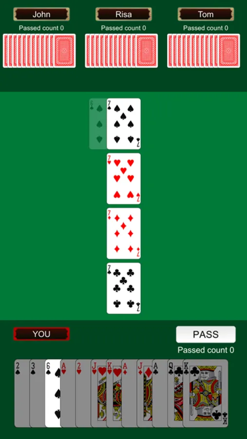 If you would like to play Fan-tan, you can play by this game. The design is for those who want to play with pictures of cards in pure form. Number of player is 4 people.(You and Three computers)