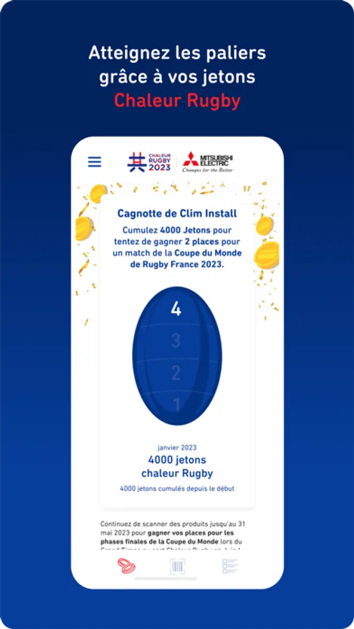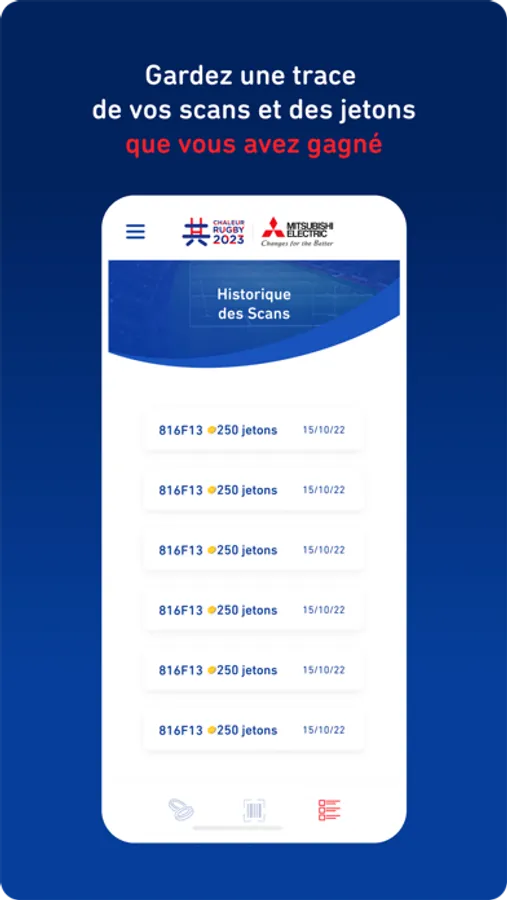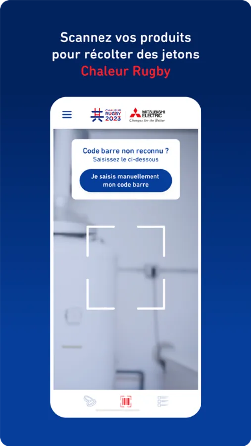 Grâce au lecteur de codes barres Mitsubishi Electric. Scannez les produits Mitsubishi Electric, accumulez des Jetons Chaleur Rugby et tentez de gagner des places pour des matchs de la Coupe du Monde de Rugby France 2023.