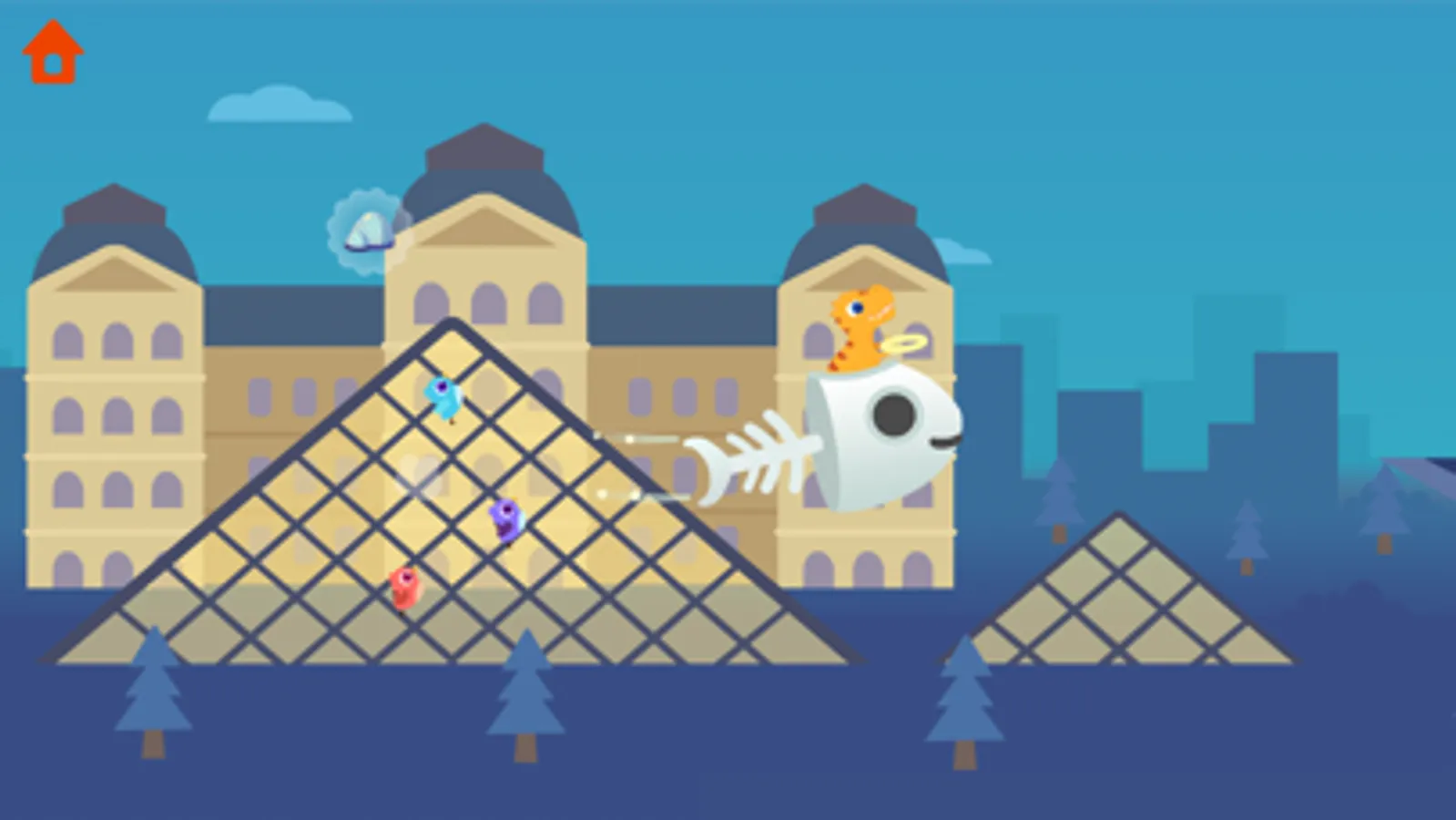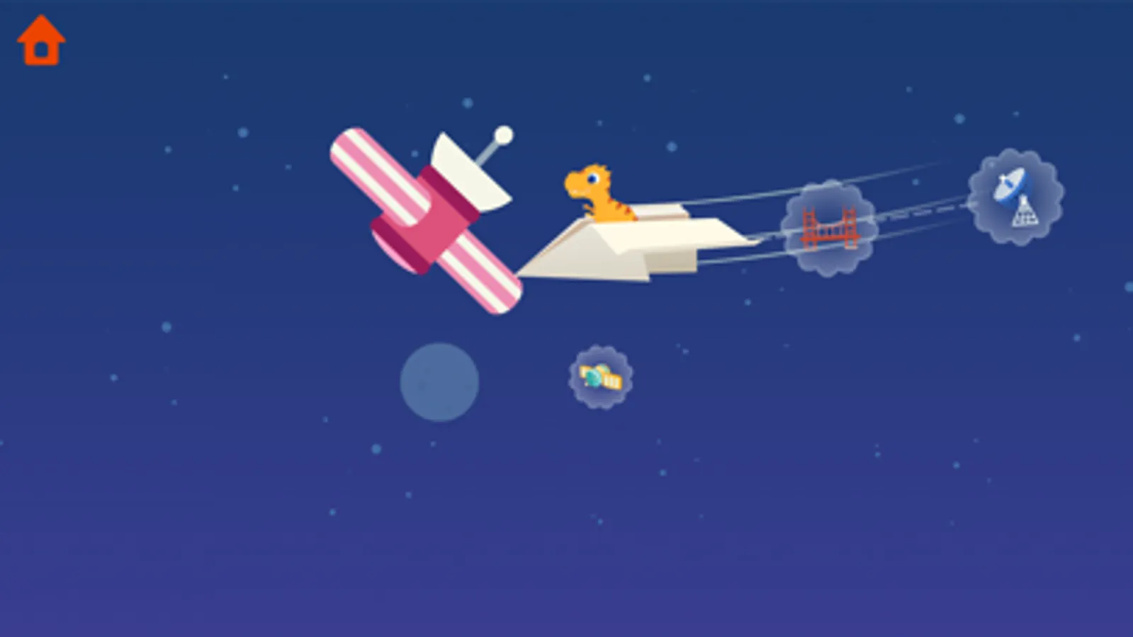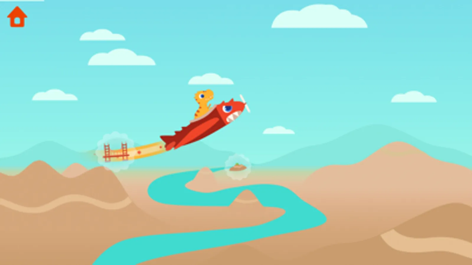 Each route features fun and engaging experiences! If you fly close enough to the ocean, fish will jump up at your plane. As you sail among the clouds, birds will fly along with you. And if you fly even higher, you can venture into space where you will see dinosaur astronauts floating by your plane!