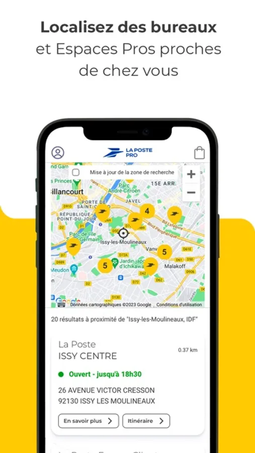 Grâce à la localisation disponible sur votre Smartphone, l’application vous permet de repérer les bureaux de Poste autour de vous afin d’optimiser vos déplacements et gérer vos envois rapidement. Découvrez les bureaux de Poste accueillant des Espaces pros et ajoutez-les dans vos favoris. Organisez facilement vos retraits avec les points de retrait les plus proches de votre entreprise pour réceptionner vos colis (Colissimo et Chronopost) et accéder à leurs informations (coordonnées, adresses, contacts, localisation).